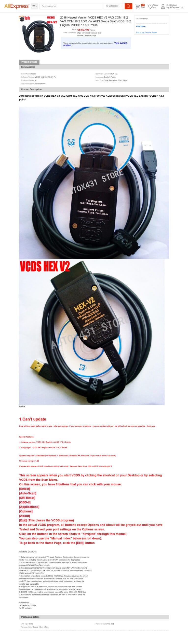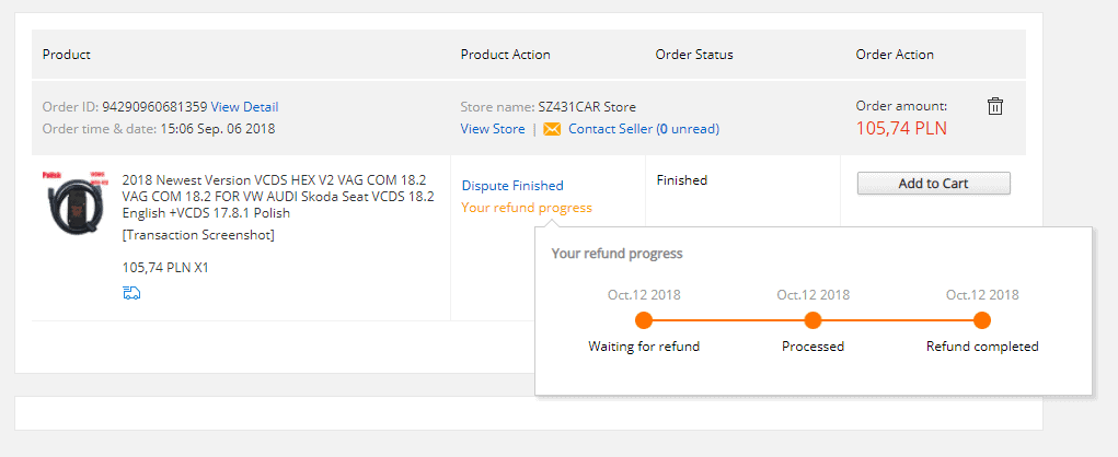 Napisałem do sprzedawcy z aliexpress, a on odpisał bezczelnie, że mój samochód jest za stary na 18.2. i chciał mi sprzedać stary VCDS 12.12 za 16,50 USD 🙈 Ale ja byłem na tyle złośliwy, że kliknąłem magiczny przycisk „Otwórz spór” 👿